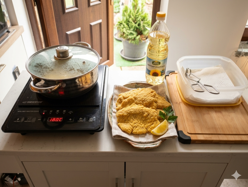 Egy professzionálisan komponált ételfotó egy konyhapulton. A kép előterében egy rusztikus, kézzel készített kerámia tálon három nagy darab, aranybarna, ropogósra sült rántott hús szelet látható. A tál egy szürke, texturált szalvétán nyugszik. A húsok tetején egy citromkarika és egy ág friss petrezselyem díszlik. A tál mellett további friss petrezselyemlevelek vannak elhelyezve. A háttérben, a bal oldalon egy fekete, hordozható indukciós főzőlapon egy rozsdamentes acél fazék áll, rajta üvegfedővel. A fazék belseje és a főzőlap felülete fényes, a főzőlap digitális kijelzője világít, jelezve, hogy működik. A fazék mögött egy fűszerpolc és további konyhai eszközök láthatók. Középen hátul egy nyitott faajtó látható, ami egy teraszra vagy kertre nyílik, ahol egy cserepes örökzöld növény áll a napfényben. A jobb oldalon egy átlátszó műanyag flakon napraforgóolaj (a címkén "napraforgóolaj" felirat olvasható) és egy üveghenger áll, amiben papírtörlő és egy fém konyhai csipesz található. A falon, a háttérben réz edények lógnak. A kompozíció természetes fénnyel megvilágított, tiszta, otthonos konyhai környezetet sugároz. A fókusz a rántott húsokon van.