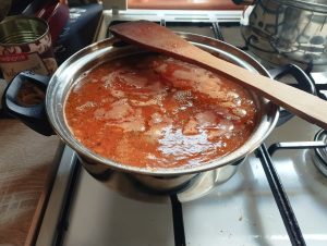 Egy kevés olajon dinszteljük meg a hagymát, majd adjuk hozzá a gombát. Miután a gomba összeesett, öntsük fel a paradicsomszósszal, és ízesítsük a fűszerekkel. Forraljuk össze pár perc alatt, hogy az ízek kiteljesedjenek.