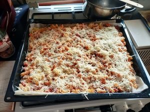 Egy sütőpapírral bélelt tepsibe borítsuk bele a leszűrt tésztát és a ragut, majd alaposan forgassuk össze. A tetejét egyenletesen szórjuk meg a reszelt sajttal.